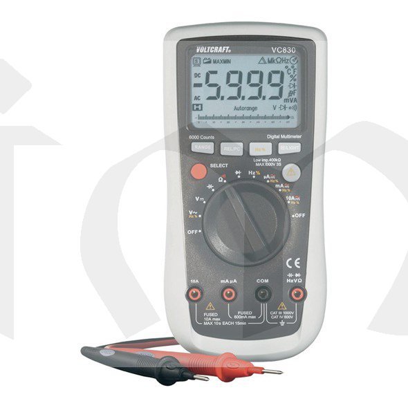 VC-830. Nová série multimetrů VOLTCRAFT®. Odolnost, spolehlivost, praktická výbava, ergonomický tvar, bezpečnost pro uživatele - to jsou atributy, jež specifikují tyto profesionální multimetry. Po stránce bezpečnosti se tento multimetr stává symbolem. Díky patentované konstrukci lze pouzdro pro výměnu baterie a pojistky otevřít pouze tehdy, když je přístroj odpojen od všech měřicích kabelů. Integrovaná funkce TLD® (Test-Lead-Detection) varuje uživatele v případě nesprávně připojených měřicích kabelů. Při vstupních napětích nad 30 V se na ukazateli objeví výstražný symbol. Multimetr má odolné pouzdro s ochranným nástřikem z měkké gumy.Jedinečnou koncepci bezpečnosti završují výkonové pojistky na 1000V se schopností odpojení proudu 30 kA a přepínaní impedance, které stisknutím tlačítka redukuje vstupní odpor kvůli zabránění chybným měřením díky rozptylovým napětím. K výbavě série patří optické rozhraní. Přístroj je schválen pro měření v kategorii přepětí CAT IV 600 V a CAT III 1000 V a zkoušen podle normy EN 61010.