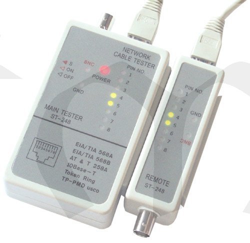 Tester pro síťové kabely zakončené konektory RJ-45 nebo koaxiální kabely. Dokáže zjistit, zda kabel není přerušený, jestli nemá zkratované některé žíly nebo zjistit typ kabelu - patch nebo cross. Lze testovat kabely jak volné přímo testerem, tak i kabely zabudované pomocí testeru a speciálního terminátoru, který se jednoduše připojí na druhý konec kabelu. (ST248)