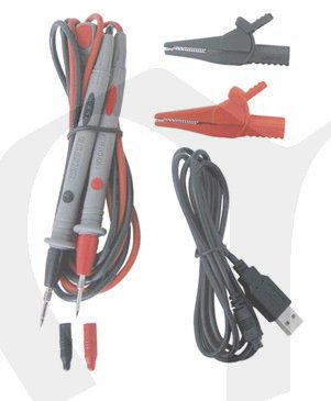 Příslušenství: testovací hroty, manuál, USB kabel, pouzdro